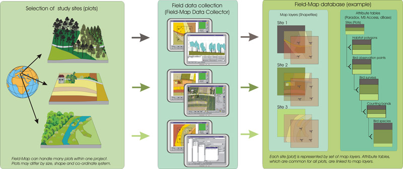 In Field-Map is possible to create and store number of projects, which may differ according to their concept and methodology. The database structure of each particular project will depend on the complexity of its methodology. That way, within the same Field-Map project is possible to create databases for multiple plots, plots of different shapes, different coordinate systems, etc.