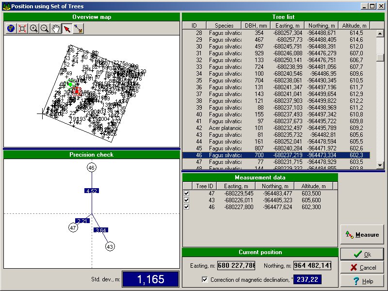 Positioning using trees is possible. It is not necessary to know the plot center during the repeated measurement. A user can select the trees that he is able to identify, Field-Map estimates his position and shows the result and precision of his position (standard deviation).