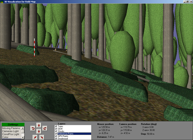 Field-Map has a modular structure. Within the common user interface a number of modules can be used to fulfill a user’s particular needs. One of these modules can be –for example- the 3D Forest. It allows a 3D visualization of Field-Map plot area. The user can move around in the computer generated forest, identify entities by the mouse and exports views to bitmaps.
